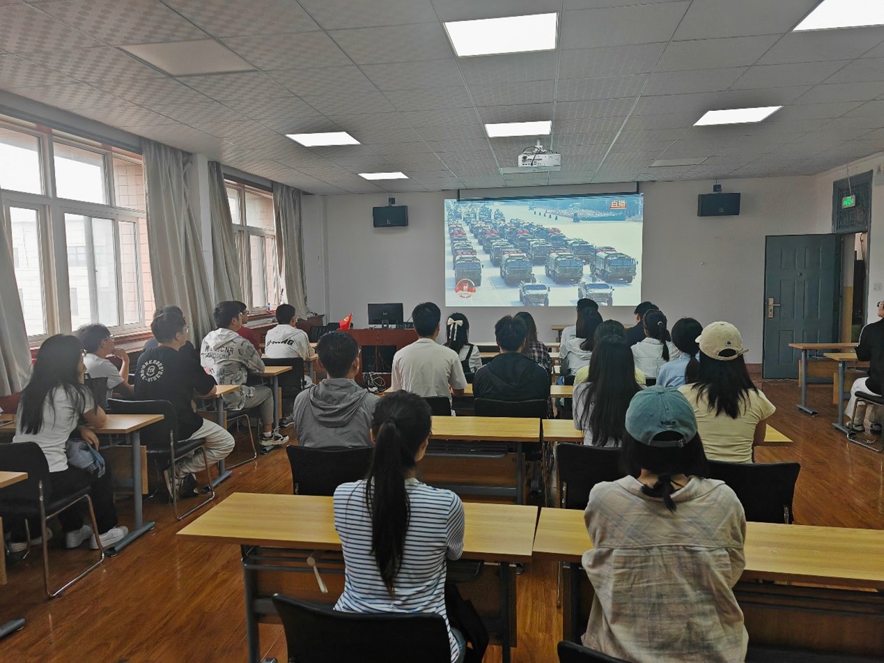 在党旗、国旗、军旗引领下,受阅方阵踏着铿锵步伐经过天安门,45个方(梯)队依次亮相,陆海空基战略重器、高超精打、无人和反无人装备彰显着现代化军队的威武气势。一幕幕震撼人心的画面,让在场师生深刻感受到国家的强大实力与民族的不屈精神,也更加深切体会到革命先烈为国家独立、民族解放作出的巨大牺牲。