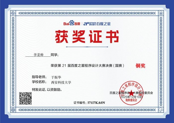 决赛当天,李姜帅同学沉着冷静、从容应战,面对复杂的竞赛题目,迅速理清解题思路,高效完成程序编写与调试。凭借清晰的逻辑架构、规范的代码实现与合理的时间分配,最终成功跻身铜奖行列,实现了西安科技大学在百度之星程序设计大赛中的历史性突破,也是学校“以赛促学、以赛促练” 人才培养模式的生动实践。